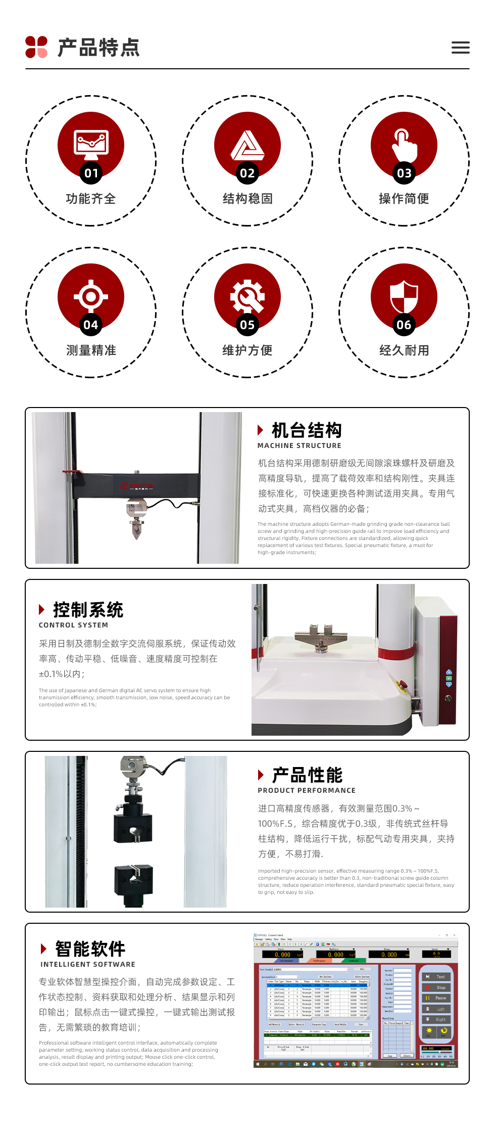 上、下機械式安全設(shè)定,緊急停止鍵,程序力量及伸長設(shè)定,試件破壞感測